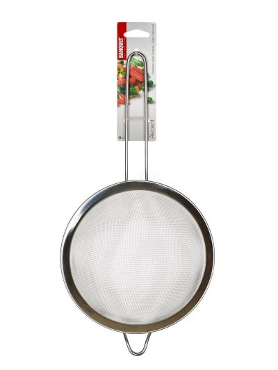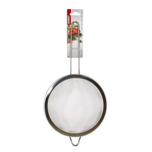 priemer: 19 cm dĺžka držadla: 17 cm držadlo so závesným očkom materiál: nerez 202 počet očiek: 20 na cm2 hrúbka siete: 0,28 mm materiál držadlá: kov