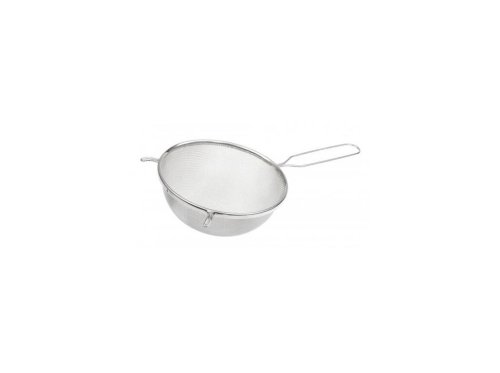 Kovové tkanivo pevne spojené s obrubou z oceľového plechu a držadlom s háčikmi z oceľového drôtu. Galvanicky lesklo pokovované. Hustota sita 1 x 1 mm, priemer 24 cm. Český výrobca. Nie je vhodné do umývačky riadu. EAN 8594020073066