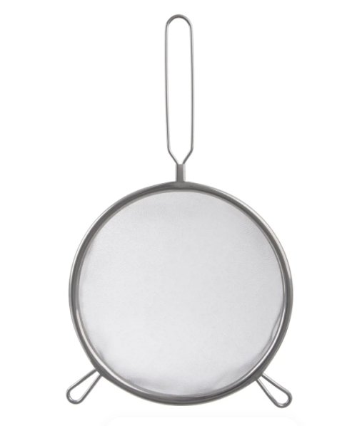 Cedník s veľmi jemným sitkom (oká 0.45 x 0.45 mm), s rukoväťou a očkom dobre drží na hrnčeku. Priemer 24.5 cm, dĺžka 39 cm. Nerezová oceľ. Vhodné do umývačky riadu. EAN 8592381227081