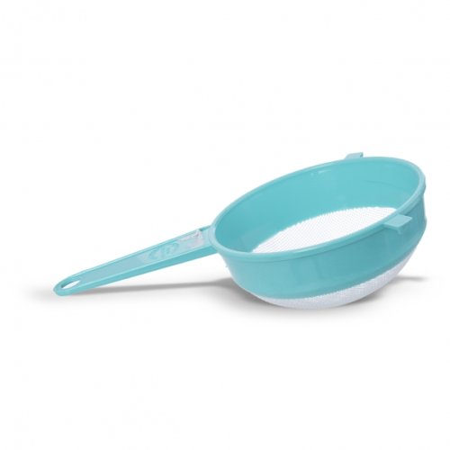 Plastový sitko s rúčkou a očkom na zavesenie priemer 16 cm, sito cca 1.3 mm. Mix farieb podľa skladovej dostupnosti, vyrobené v EU. EAN 5904371000193