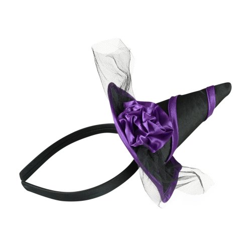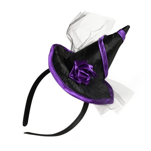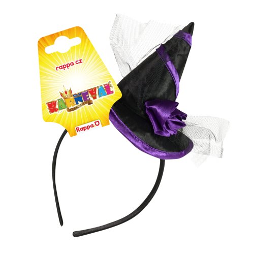 Štýlová čelenka je perfektným doplnkom na večierok alebo Halloween párty! Čierno-fialová čelenka je doplnená saténovým mini klobúčikom a tylovou ozdobou s kvetinou.