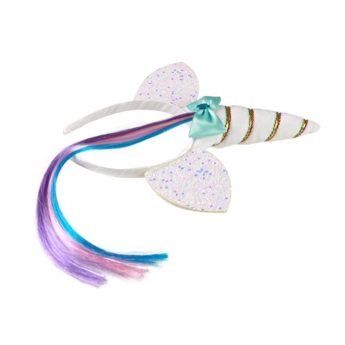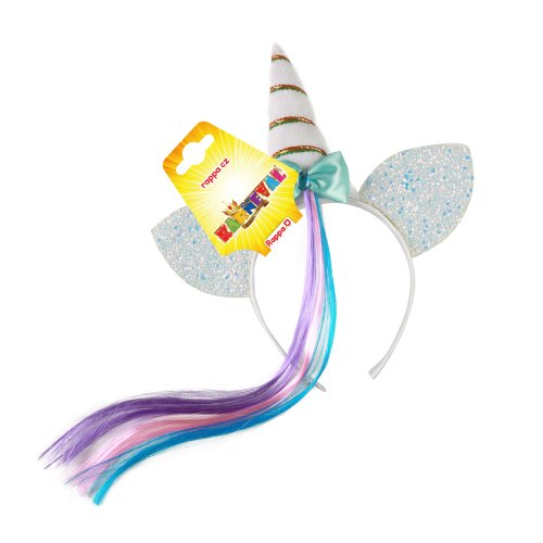 Senzačná karnevalová čelenka v štýle jednorožca! Biela čelenka s rohom so striebornými ušami, ozdobená mašľou a dúhovým pramienkom vlasov.