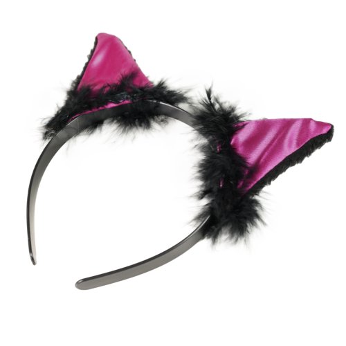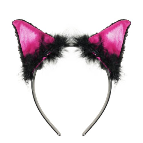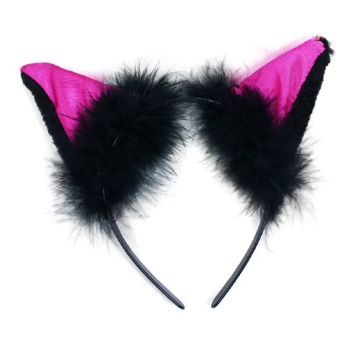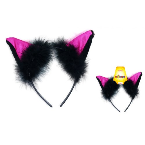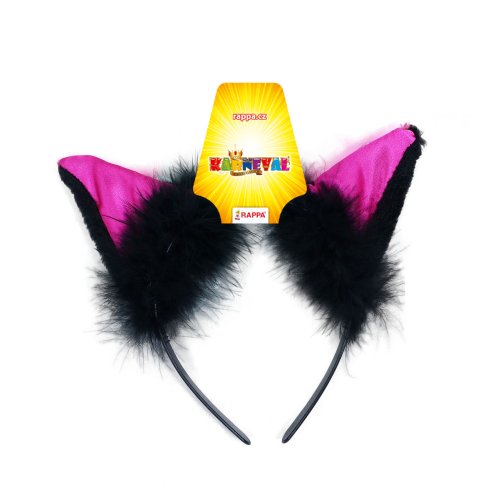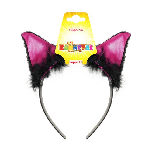 Karnevalová čelenka s mačacími ušami ružovo-čiernej farby a perím je perfektným doplnkom ku kostýmu mačky.