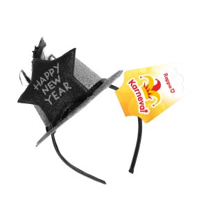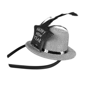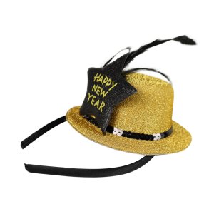 Štýlový mini klobúk zlatej farby s nápisom HAPPY NEW YEAR je senzačným doplnkom na oslavu alebo večierok pri vítaní Nového roka! Klobúčik je pripevnený na čelenke pomocou gumičiek.