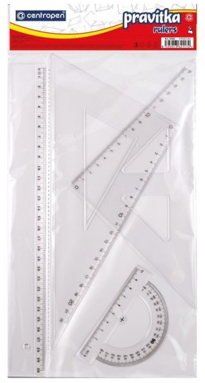 Súprava obsahuje trojuholník s ryskou 45°/177, trojuholník 60°/250, uhlomer 180°/100 s ryskou a pravítko 30 cm, číry plast.