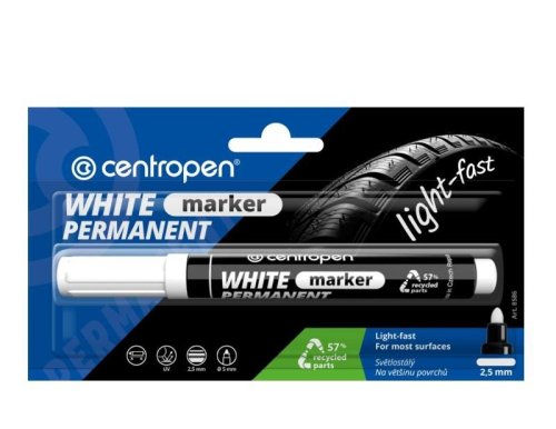 Univerzálny biely značkovač, píše na väčšinu povrchov, po zaschnutí odolá za sucha oteru, na poréznych povrchoch permanentný, svetlostály, vodné bázy, skladovať vo vodorovnej polohe, valcový hrot, šírka stopy 2,5 mm, 97% recyklovaného materiálu.