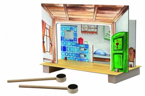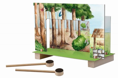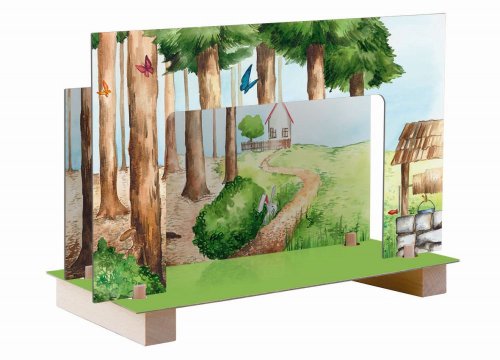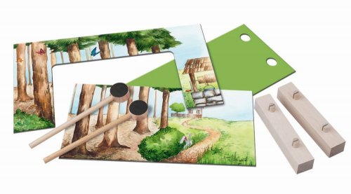 Obsah balenia: 2 drevené podstavce, obojstranné kulisy z tvrdého papiera, 2 vodiace paličky a 5 figúrok.