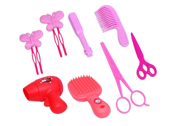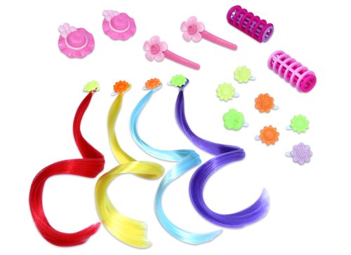 Česacia hlava s príslušenstvom. Veľkosť 22 cm. Súčasťou hrebeň, kulma, farebné pramene vlasov, sponky. Vek: 3+