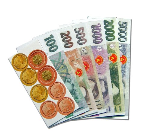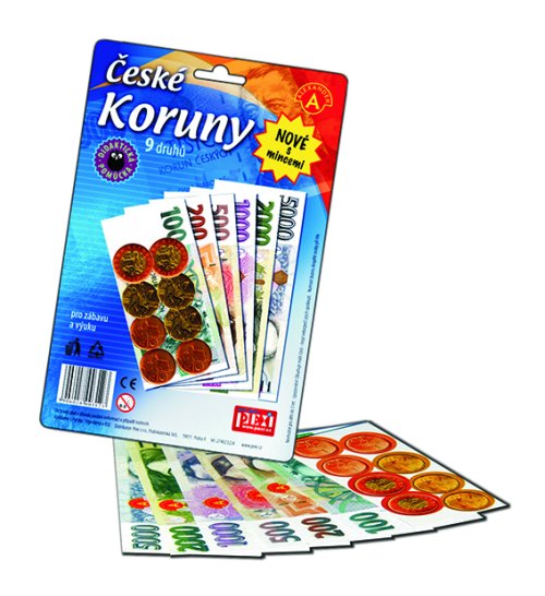 České koruny s mincami - peniaze do hry bankovky s mincami. V balení nájdete 6 druhov veľkých a sýto farebných českých bankoviek ak tomu ešte mince 10, 20 a 50 Sk. Vhodné k rôznym detským hrám a ako náučná pomôcka. Poslúži nielen ako doplnok k rôznym hrám na nákupy, ale aj na zoznámenie malých detí s hodnotou peňazí, alebo pre školskú výučbu.