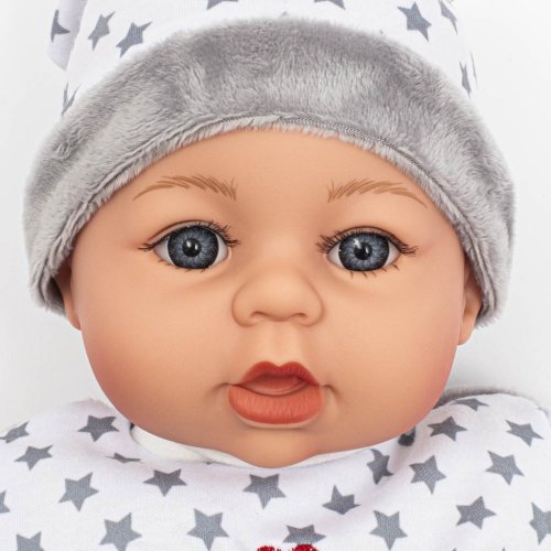 Krásna detská bábika PlayTo. Skvelá hračka pre každé dievčatko, ktoré bude mať svoje hovoriace bábätko. Hlava, ruky a nohy sú vyrobené z gumy, telíčko potom z mäkkého materiálu, vďaka čomu sa môže dieťa k bábike krásne pritúliť. Bábika má cumlík. Bábika má milú tváričku, ktorá vyzerá ako ozajstné bábätko a získa si srdce dievčatka svojimi modrými kukadlami a ružovými pierkami. Má roztomilé oblečenie a čiapočku. Oblečenie je možné zložiť a vyprať. Dĺžka bábiky je 46 cm, je zabalená vo farebnej krabici a hodí sa ako milý darček. Bábika má modul, ktorý hovorí 4 jazykmi: po poľsky, česky, slovensky a maď arsky.Modul po stlačení prehráva 5 piesní a hovorí 14 českých viet.