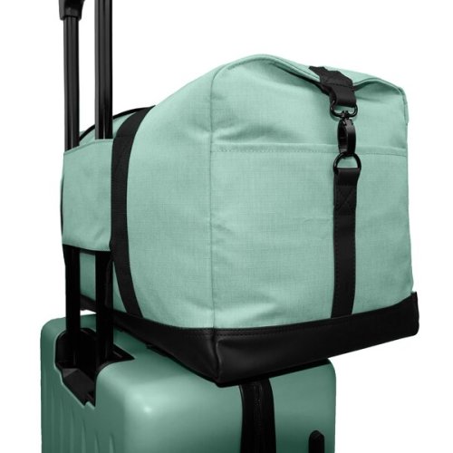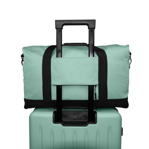 • Odnímateľný nastaviteľný ramenný popruh., * Rukoväť pre ľahšie prenášanie., * Možnosť pripevnenia na kufor pomocou zadného popruhu na zips, ktorý možno prípadne využiť aj ako ďalšie vrecko., * Spodná časť tašky potiahnutá materiálom v čiernej farbe, odolným proti vode a nečistotám., * Taška z vodeodolného materiálu Rips . recyklovaných PET fliaš., * Materiál s impregnáciou proti vode a špine., Tip: Cestovnú tašku si môžete farebne zladiť s praktickými doplnkami ako je kufor, kozmetický kufrík alebo oblička., Obrázok upevnenia tašky na kufor je iba ilustračný.