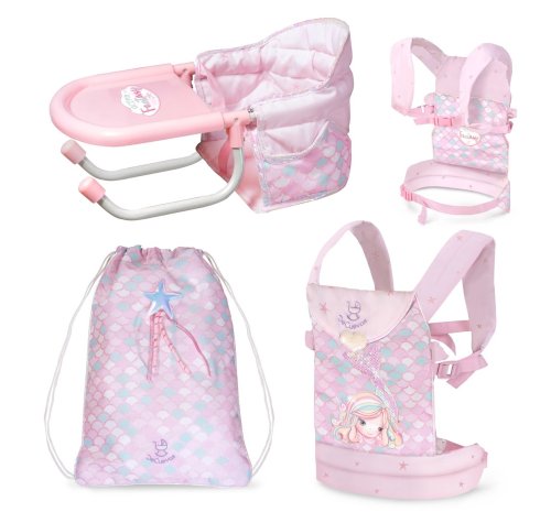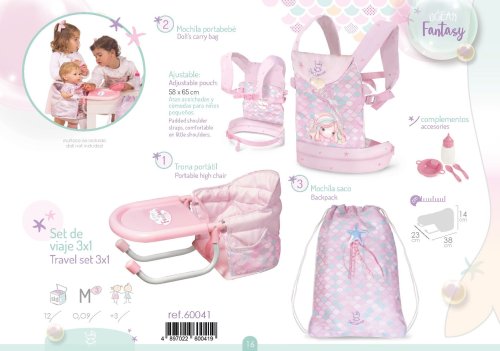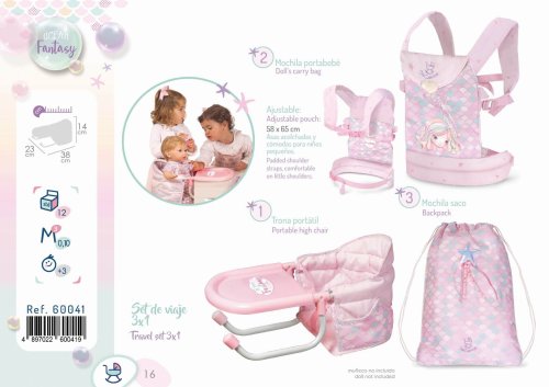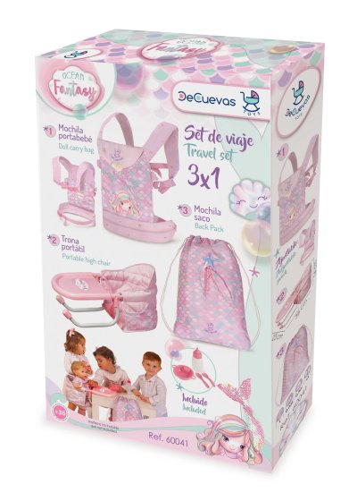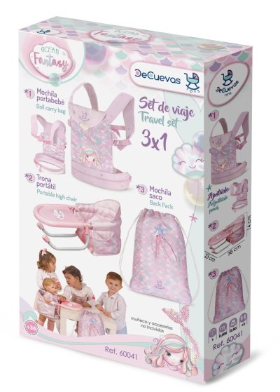 DeCuevas 60041 Cestovný set pre bábiky 3 v 1 Ocean Fantasy 2021, z prekrásnej svetlo ružovej kolekcie s malou morskou vílou, je nevyhnutnou súčasťou výbavy každej malej slečny, ktorá berie rada svoju bábiku so sebou na výlety. Ocenia ju ale iste aj rodičia, vďaka jej praktickému využitiu. Prenosná stolička nahradí doma veľkú jedálenskú stoličku a nosítko na bábiku sa dá vziať so sebou do auta predsa len ľahšie ako kočík.