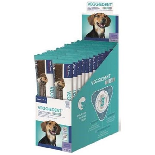 CET VeggieDent Ochutené doplnkové krmivo pre stredné psy (10-30 kg). Rastlinné žuvacie plátky, ktoré udržia zubný kameň a plak pod kontrolou. CET VeggieDent Chews s inovatívnym Z-tvarom, ktorý psovi uľahčuje plátok uchopiť a žuť. Tento tvar, veľkosť a textúra pomáhajú redukovať tvorbu povlaku a zubného kameňa, slúžia tak ako doplnok k bežnému čisteniu zubov. Produkt získal pečiatku VOHC (Veterinary Oral Health Council = Veterinárna rada pre orálne zdravie). Rada označenie udeľuje iba produktom, ktoré doložia požadované výsledky účinnosti redukcie plaku a zubného kameňa. Zloženie: Kukuričný škrob, glycerín, sójový proteínový koncentrát, ryžová múka, pivné kvasnice, sorbitol, klasy kukurice, polyol (erytritol), čakankový inulín, koncentrát z granátového jablka. Analytické zložky: Hrubý proteín 19,0%, hrubý popol 1,8%, hrubá vláknina 1,3%, hrubý tuk 0,9%. Návod na použitie: Podávajte psovi 1 žuvačku CET VeggieDent denne alebo podľa pokynov veterinára. Tento prípravok je vhodný pre psy medzi 10 - 30 kg. Vždy by mala byť k dispozícii čerstvá pitná voda. Spôsob uchovávania: Uchovávajte na suchom mieste pri izbovej teplote.