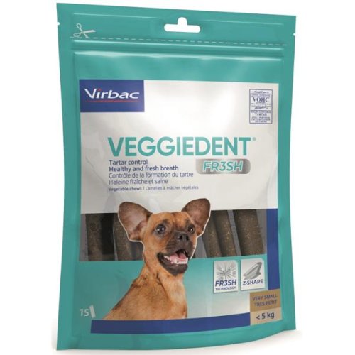 Rastlinné žuvacie plátky, ktoré udržia zubný kameň a plak pod kontrolou. CET VeggieDent Chews s inovatívnym Z-tvarom, ktorý psovi uľahčuje plátok uchopiť a žuť. Tento tvar, veľkosť a textúra pomáhajú redukovať tvorbu povlaku a zubného kameňa, slúžia tak ako doplnok k bežnému čisteniu zubov. Produkt získal pečiatku VOHC (Veterinary Oral Health Council = Veterinárna rada pre orálne zdravie). Rada označenie udeľuje iba produktom, ktoré doložia požadované výsledky účinnosti redukcie plaku a zubného kameňa. Balenie obsahuje 15 ks. Zloženie: kukuričný škrob, glycerín, sójový proteínový koncentrát, ryžová múka, pivné kvasnice, sorbitol, klasy kukurice, polyol (erytritol), čakankový inulín, koncentrát z granátového jablka. Analytické zložky: hrubý proteín 19,0 %, hrubý popol 1,8 %, hrubá vláknina 1,3 %, hrubý tuk 0,9 %. Návod na použitie: Podávajte psovi 1 žuvačku CET VeggieDent denne alebo podľa pokynov veterinára. Tento prípravok je vhodný pre psy do 5 kg. Vždy by mala byť k dispozícii čerstvá pitná voda. Spôsob uchovávania: Uchovávajte na suchom mieste pri izbovej teplote.