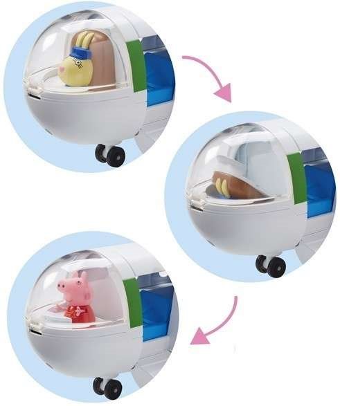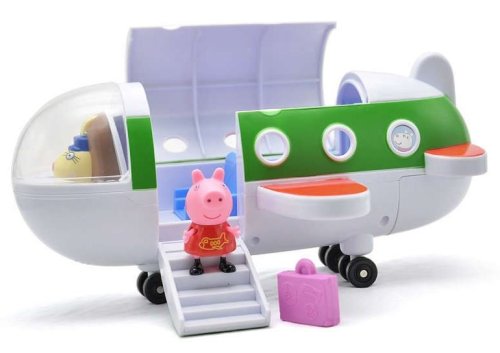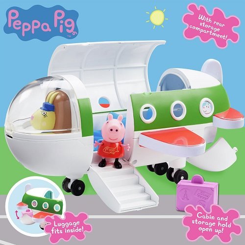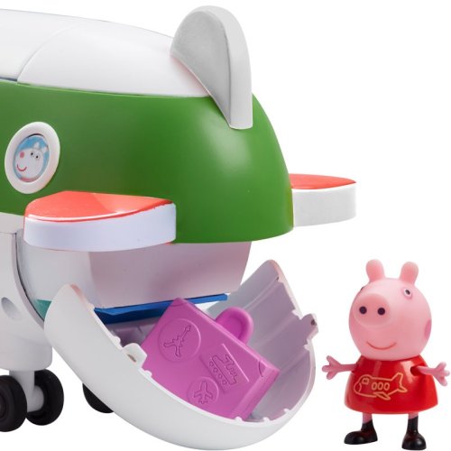 Prasiatko Peppa letí na dovolenku perfektným lietadlom, ktoré riadi šikovná pani pilotka. Lietadlo má otváraciu strechu a vyklápacie schody, takže si do neho Peppa pohodlne nasadne. Na cestu si zabalí kufor a hurá, dovolenka sa môže začať. Lietadlo má tiež otvárací kokpit (po pretočení kokpitu môže lietadlo riadiť niekto ďalší) a zadnú časť lietadla ide otvoriť (je možné možnosť uschovania batožiny). Kolesá lietadla sa točia. Obsah balenia: