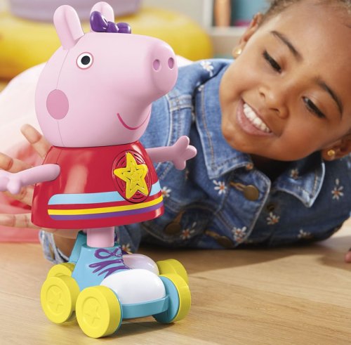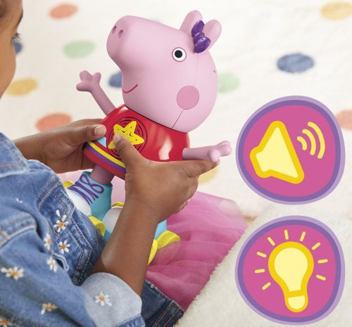 Peppa meria 28 cm a je vybavená svetlami, zvukmi, rečou a hudbou jemne ju zatlačte dopredu alebo ju zatiahnite dozadu a potom ju pustite, aby sa pri prehrávaní zábavných melódií pohybovala dopredu na korčuliach deti môžu tiež stlačiť hviezdičku na Peppinom oblečení, aby počuli zábavné frázy , chrochtanie a tri pesničky pre prevádzku sú potrebné batérie 3x LR44 (sú súčasťou balenia) POZNÁMKA: hovorená a spievaná časť je v anglickom jazyku