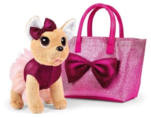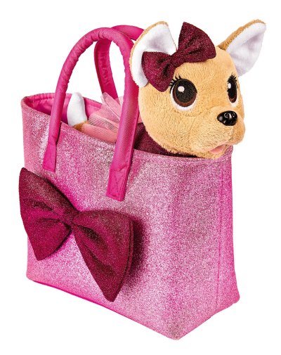 Plyšový psík čivava s mašľou v ružovom trblietavom oblečku s taškou s mašľou.
