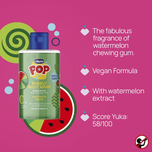 Chicco Pop je kozmetický rad navrhnutý tak, aby bol čas kúpania vzrušujúci a zábavný pre všetky deti. Tento sprchový gél s neodolateľnou vôňou melónu premení každé kúpanie vo chvíle plnej radosti a osvieženia.