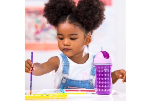 Hrnček Chicco Sport so slamkou pomáha dieťaťu učiť sa piť zo slamky a kontrolovať prietok nápoja aj na cestách bez neporiadku .