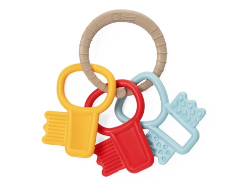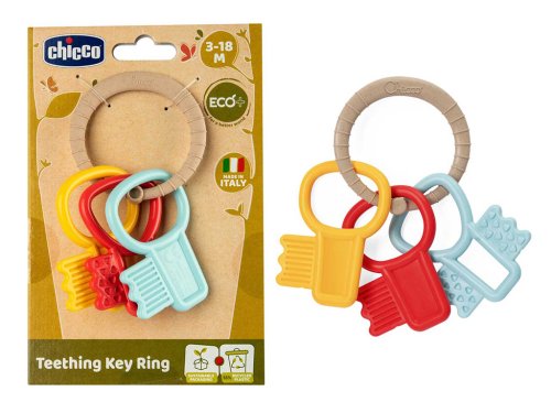 Ikonické hryzátka Chicco v tvare klíčkov z kolekcie Eco+ je vyrobená z recyklovaného plastu. Hryzátko stimuluje koordináciu, hrká pri trasení a upokojuje ďasná pri raste zúbkov. Má 3 rôznofarebné hrkajúce klíčky s rôznymi vložkami a textúrami, vďaka ktorým zvyšuje záujem dieťaťa a podporuje rozvoj jeho zručností.