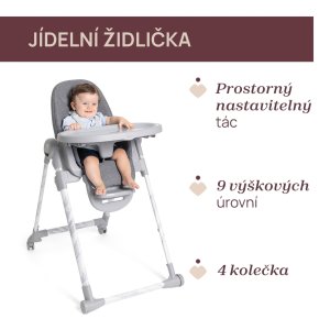 Nastaviteľnosť Jedálenská stolička je možné výškovo nastaviť do 9 rôznych pozícií a prispôsobí sa tak výške, ktorú aktuálne potrebujete. Má 4 kolieska vďaka ktorým viete stoličku prakticky presúvať. Opierka chrbta je možné nastaviť do úplného ľahu. Opierka nožičiek je taktiež nastaviteľná pre úplný komfort dieťaťa.