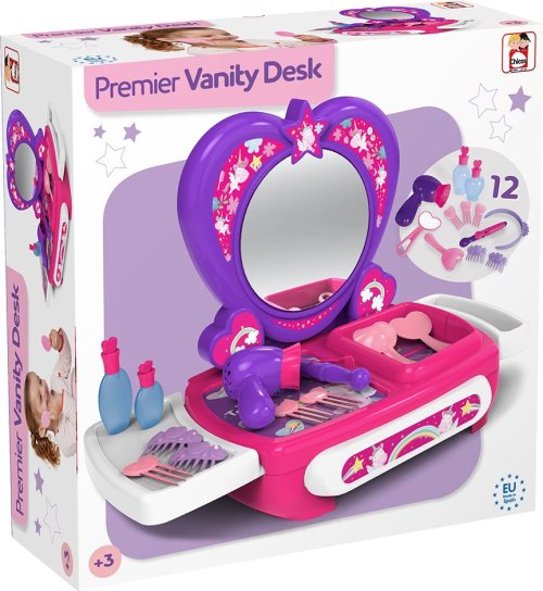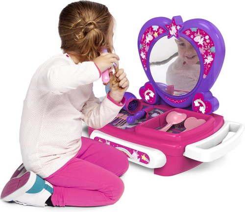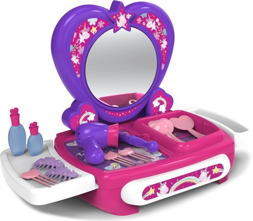 súčasťou je veľké zrkadlo, v ktorom uvidíte každý detail obsahuje 12 doplnkov: fén, hrebeň, fľaštičky na parfémy, sponky do vlasov a veľa ďalších.