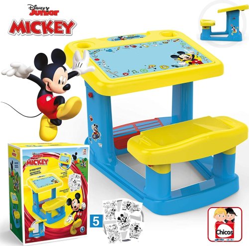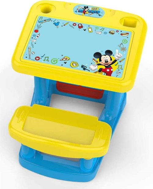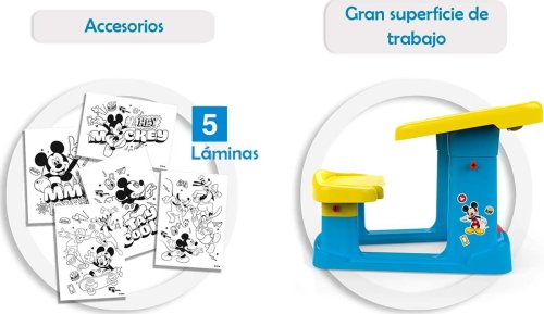 stolček s pohodlným a priestranným sedadlom zdobený motívom myšiaka Mickey, v doske stolčeka je priehradka pre rôzne potreby na kreslenie a tvorenie, pod lavicou je podnožka pre maximálne pohodlie, súčasťou je 5 omaľovánok, vyrobená z vysoko odolného plastu.