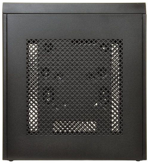 Čierna počítačová skriňa formátu Mini ITX. Skriňa je dodávaná so zdrojom s výkonom 120 W.