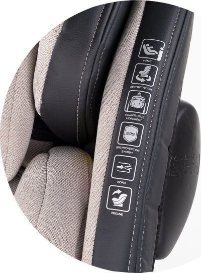intuitívna a pohodlná inštalácia pomocou systému ISOFIX = rýchly spôsob inštalácie detskej autosedačky - systém Isofix znižuje sily pôsobiace na dieťa v prípade náhleho zbrzdenia vozidla, zaisťuje vynikajúcu ochranu a pohodlie počas cestovania, 360 ° otočenie na plastovej základni, 5 bodové bezpečnostné pásy s ochranným polstrovaním, dĺžkovo nastav. hlavy do 11 stupňov, vynikajúca ochrana proti bočnému nárazu, polstrovanie pre podporu hlavičky a tela dieťaťa, integrovaný 3D vankúšik pre zníženie tlaku na pás a chrbát dieťaťa, poťah je možné sňať a vyprať, pohodlná a mäkká opierka nôh pre dieťa.