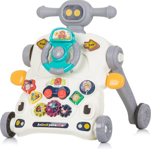 multifunkčná hračka - možno ju použiť ako stolček na hranie alebo ako chodítko hudobná hračka pre deti od 6 mesiacov chodítko na tlačenie pre deti, ktoré vedia samostatne chodiť volant je možné môže otáčať rôzne druhy hier pre dlhšie udržanie pozornosti batoliat melódie, svetlá a zvuky pohodlné, ľahké a ľahko sa tlačí výškovo nastaviteľné možnosť umiestniť na spodnú stranu panela fľašu s vodou pre zvýšenie hmotnosti a stability hračky pre prevádzku výrobku sú potrebné 2 ks 1,5 V batérií AAА (nie sú súčasťou balenia) rozmery: 41 x 41 x 44 cm