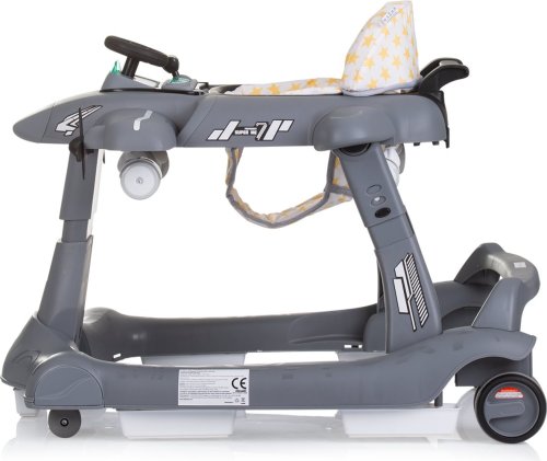 vhodné pre deti od 6 mesiacov s hmotnosťou do 12 kg, hornú časť je možné oddeliť a premeniť na tlačiacu hračku - lietadlo, zábavný hrací panel s hračkami a hudbou, vyrobené z kvalitného a bezpečného plastu, široká základňa pre lepšiu stabilitu, 3 úrovne výšky sedátka pre prispôsobenie rastu dieťaťa, inovatívne regulácia rýchlosti a kolies proti prevráteniu a pádu zo schodov, 4 kolieska (predné otočné o 360 °), jednoduché skladanie a kompaktné skladovanie, jednoduchá montáž, napájanie: 2× AA,1,5V batérie (nie sú súčasťou balenia), vyrobené v súlade s európskou normou EN 1273.