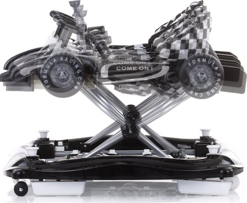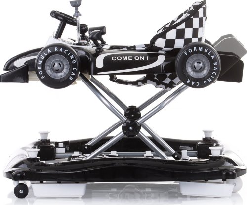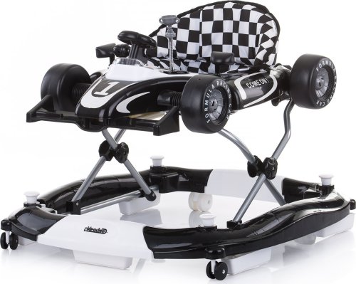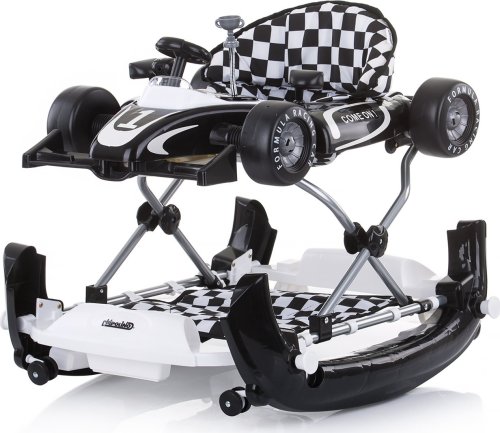 4v1 = chodítko (bez textilnej základne), hojdačka , hracie centrum (dieťa šliape na textilnú základňu a hrá sa) a postrkovacia hračka pre prvé krôčiky široká základňa pre lepšiu stabilitu 3 výškové polohy sedátka, ktoré zodpovedajú výške dieťaťa 6 zarážok zabraňujúcich prevráteniu alebo pádu zo schodov 4 kolieska - predné kolieska sa otáčajú o 360 stupňov hrací pultík v tvare formule je možné odpojiť a premeniť na autíčko na tlačenie ľahko sa skladá a skladuje jednoduchá montáž vyrobené z kvalitných a bezpečných plastov
