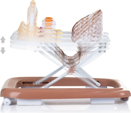 široká základňa pre lepšiu stabilitu, 3 výškové polohy sedátka, ktoré zodpovedajú výške dieťaťa, 6 zarážok zabraňujúcich prevráteniu alebo pádu zo schodov, 4 kolieska - predné kolieska sa otáčajú o 360 °, pultík s interaktívnym panelom a hrazdičkou, ľahko sa skladá a skladuje, snáď montáž AA (nie je súčasťou balenia).