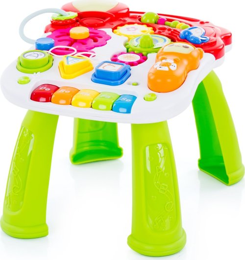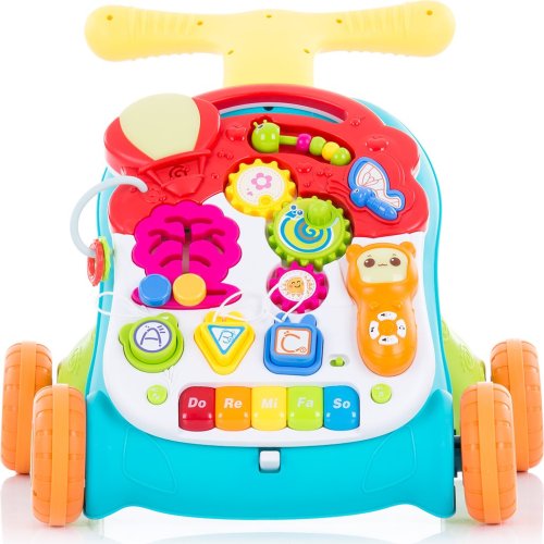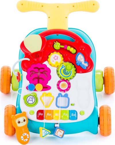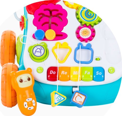 Chodítko na tlačenie pre deti, ktoré vedia samostatne chodiť. Hrací stolík na skúmanie a objavovanie. Farebné, zaujímavé a interaktívne – stimuluje sluch, zrak, zlepšuje fyzickú koordináciu a rovnováhu dieťaťa. Rôzne druhy hier pre dlhšie udržanie pozornosti batoliat. Prehráva melódie a zvuky. Hrací pultík a mobilný telefón sú odnímateľné a je možné ich používať samostatne. Pohodlné, ľahké a ľahko sa tlačí. Výškovo nastaviteľná rukoväť. Balené vo farebnej darčekovej krabici. Pre prehrávanie hudby je treba 3 ks 1,5 V batérií АА a na prevádzku mobilného telefónu 2 ks 1,5 V batérií AAA (batérie nie sú súčasťou balenia).