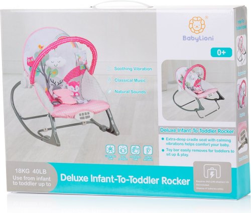 vhodné pre dojčatá a malé deti s hmotnosťou do 9 kg do veku približne 6 mesiacov, možno použiť ako stoličku pre deti, ktoré môžu samostatne sedieť, s maximálnou hmotnosťou 18 kg do veku 36 mesiacov, dve polohy operadla, hojdacia funkcia, príjemné melódie v kombinácii s upokojujúcimi vibráciami, hrazdička so zavesenými hračkami, 3-bodové bezpečnostné pásy, na prevádzku sú potrebné 3ks AA,1,5V batérií (nie sú súčasťou balenia), rozmery hojdadla: 47 x 66 x 58 cm.