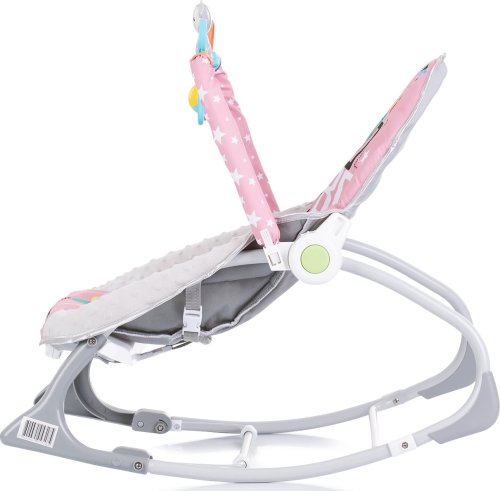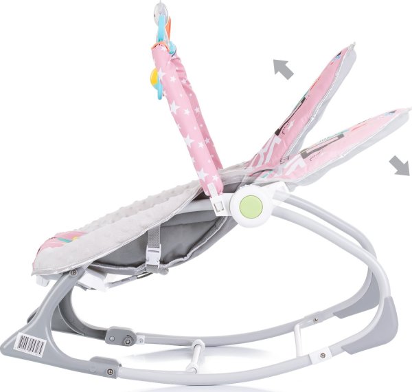 2v1 = hojdačka a stolička, hojdačka pre bábätká a deti vo veku 0-6 mesiacov vážiace max 9 kg, ktoré nevedia samostatne sedieť, stolička pre samostatne sediace deti vážiace max 18 kg vo veku do 36 mesiacov, nastaviteľné operadlo do 2 polôh, oblúk sa závesnými hračkami, hojdacia funkcia, hudobný box s melódiami a vibráciami, 3-bodové bezpečnostné pásy, rozvíja predstavivosť a motoriku.