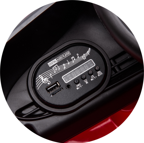 hudobný panel s MP3, AUX, USB a zásuvkou pre TF kartu, pozvoľný rozjazd, vysoká a nízka rýchlosť, bezpečnostný pás, batéria: 1 ks 12V, 4,5 AH, rýchlosť auta: 3 - 3,2 km, h, doba nabíjania batéria: 9-10 hodín, poistka: 1 * 5A, frekvencia diaľkového ovládania: 2,4 GHz, do volantu sú potrebné 2ks batérií 1,5 V, АA (LR6) (batérie nie sú súčasťou výrobku), do diaľkového ovládania sú potrebné 2ks batérií 1,5V,АAА(LR03) (nie sú súčasťou výrobku), auto je možné nabíjať pomocou AC,DC adaptéra - v: 120-240V,50,60Hz výstup: 12V DC 500mA (je súčasťou výrobku).