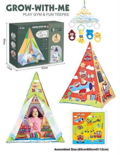 Mäkká tkanina s rôznymi povrchmi, pestré farby, stimuluje zmyslové vnímanie, dva oblúky so 4 závesnými hračkami (hrkálky), okolo zrkadla je možné pripevniť závesné hračky a potom zavesiť dovnútra stanu, pre domáce aj vonkajšie použitie, látkové časti možno prať v práčke - program na jemné pranie, studená voda.