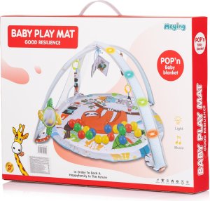 mäkká polstrovaná podložka s veselým a farebným dizajnom, zavesené hračky a zrkadlo pre zmyslovú stimuláciu, súčasťou sady sú viacfarebné plastové loptičky, odnímateľné oblúky - ľahko sa premení na bazénik s loptičkami, ľahko sa skladá a ukladá, podporuje rozvoj zraku, sluchu a jemnej motoriky, povzbudzuje. rastie s dieťaťom – od hracej deky až po bazénik s loptičkami, ponúka bezpečné a podnetné prostredie na hranie, rozmery: 83 × 83 × 50 cm.