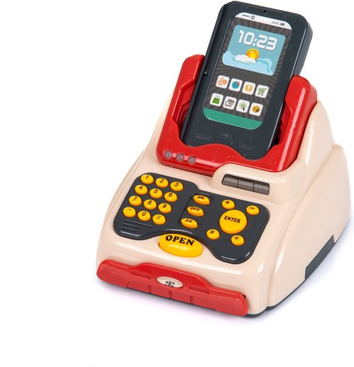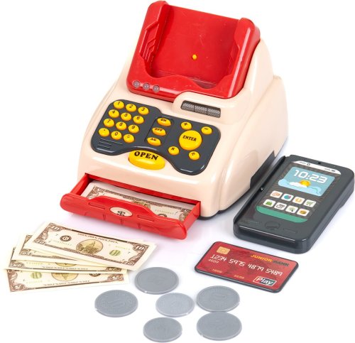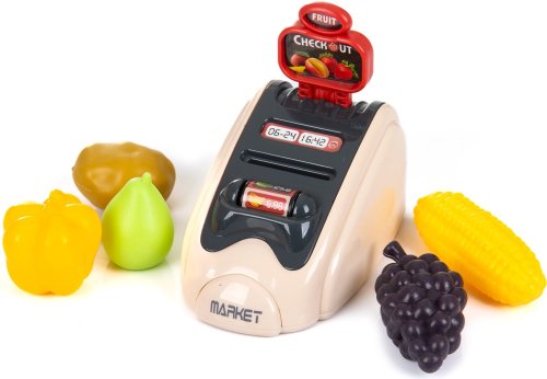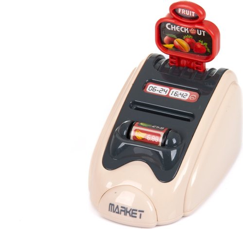 obsahuje 24ks príslušenstvo - podkladňu, mince, bankovky, platobnú kartu, mobil, potraviny a ďalšie, interaktívna hračka so zvukmi a svetlami, na prevádzku sú potrebné batérie (nie sú súčasťou balenia): 2ks AAA,1,5V pre terminál + 2ks AA,1 ,5V pre skener + 2ks AA,1,5V pre pokladňu.