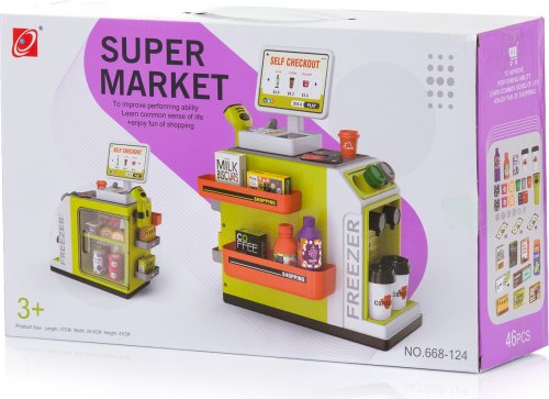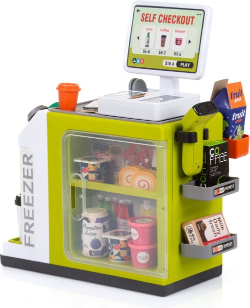 obsahuje 46ks príslušenstvo - pokladňu, mince, bankovky, platobnú kartu, potraviny, nápoje a ďalšie, interaktívna hračka so zvukmi a svetlami, na prevádzku sú potrebné batérie 2ks AAA,1,5V pre skener a 2ks AA,1,5V pre pokladňu (nie sú súčasťou balenia), rozmery hračky: 41 x 37 x 20,5 cm.