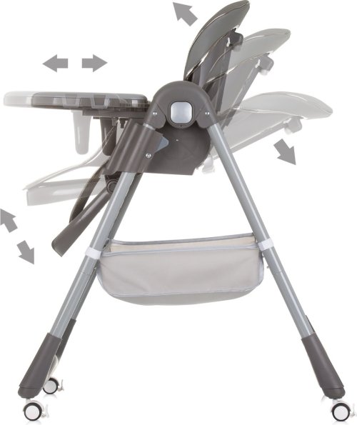 nastaviteľná opierka chrbta do 4 polôh, výškovo nastaviteľné sedadlo do 7 polôh, nastaviteľná opierka nôh do 2 polôh, široký a pohodlný sedák z EKO kože, 5bodové bezpečnostné pásy s mäkkými ramennými vankúšikmi, dvojitý podnos na potraviny - horný podnos je odnímateľný pre ľahké čistenie, základný podnos na potraviny je vybavený ochrannou T-tyčou, posúvateľný podnos dopredu a dozadu do 4 polôh, hrazdička s hračkami pre zábavu, 4 kolieska pre ľahké premiestňovanie, úložný kôš na hračky a príslušenstvo, kompaktný na skladovanie, rozmery stoličky: 68 x 51 x 110 cm, rozmery zloženej stoličky: 30 x 51 x 95 cm.