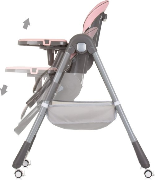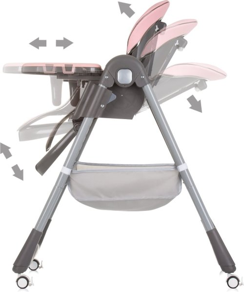 nastaviteľná opierka chrbta do 4 polôh, výškovo nastaviteľné sedadlo do 7 polôh, nastaviteľná opierka nôh do 2 polôh, široký a pohodlný sedák z EKO kože, 5bodové bezpečnostné pásy s mäkkými ramennými vankúšikmi, dvojitý podnos na potraviny - horný podnos je odnímateľný pre ľahké čistenie, základný podnos na potraviny je vybavený ochrannou T-tyčou, posúvateľný podnos dopredu a dozadu do 4 polôh, hrazdička s hračkami pre zábavu, 4 kolieska pre ľahké premiestňovanie, úložný kôš na hračky a príslušenstvo, kompaktný na skladovanie, rozmery stoličky: 68 x 51 x 110 cm, rozmery zloženej stoličky: 30 x 51 x 95 cm.