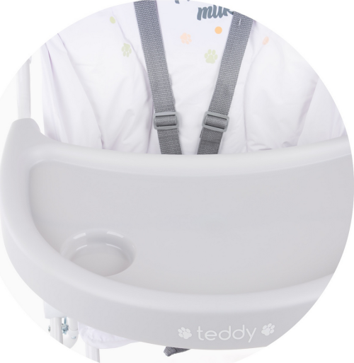 Skladacia jedálenská stolička TEDDY s jemnými vzormi má priestranný pultík na jedlo a široké a pohodlné sedadlo. Vlastnosti: