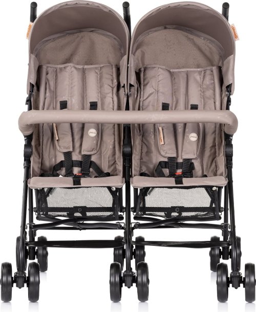 ľahký klasický rám, ľahké a kompaktné skladanie typu „dáždnik“, 2 polohy operadla na každom sedadle, 5-bodový bezpečnostný pás s mäkkými ramennými vypchávkami na každom sedadle, sklopná strieška, predné bezpečnostné madlo – spoločné pre obe deti, pohodlné rukoväte potiahnuté vysoko kvalitným materiálom, veľký.