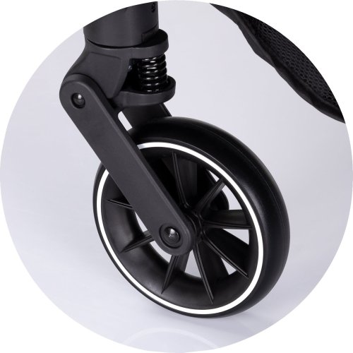 ľahký hliníkový rám, 3D automatické skladanie jednou rukou, nastaviteľné a polohovateľné operadlo, odnímateľné predné madlo s poťahom z eko kože, 5-bodový bezpečnostný pás s mäkkýmramenným polstrovaním nastaviteľná strieška s priehľadovým okienkom a slnečnou clonou, nastaviteľná opierka nôh, sieťovaná časť na zadnej strane kôš, kolesá sú ľahko odnímateľné s odpružením, brzda na zadných kolesách, polstrovaný nánožník, taška na príslušenstvo - praktické vrecká a prebaľovacia podložka, držiak na nápoj.