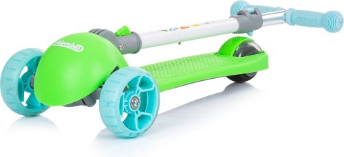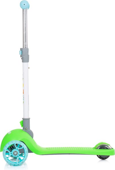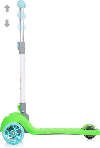 vhodné od 3 rokov, nosnosť 50 kg ľahký hliníkový rám výškovo nastaviteľné riadidlá do 3 polôh gumové protišmykové rukoväte priemer kolies: predné 12 cm, zadné 8 cm predné aj zadné kolesá s farebnými LED svetlami nášľapná brzda na zadnom kolese široké protišmykové stúpadlo riadidlá je možné zložiť pre kompaktné skladovanie