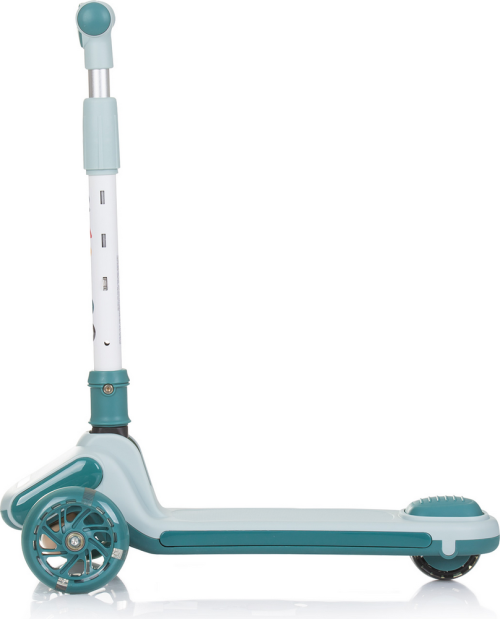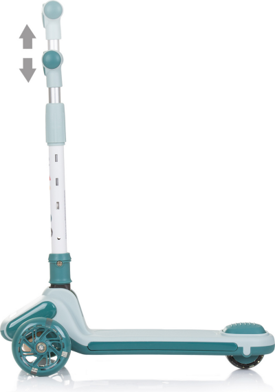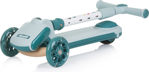 ľahký hliníkový rám, výškovo nastaviteľné riadidlá, gumové protišmykové rukoväte, predné aj zadné kolesá s farebnými LED svetlami, nášľapná brzda na zadnom kolese, široké protišmykové stúpadlo, riadidlá je možné zložiť pre kompaktné skladovanie.