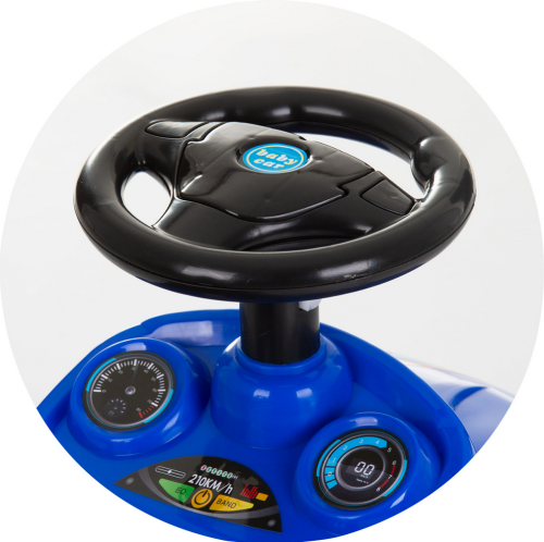 stimuluje rozvoj motorických zručností a koordináciu pohybu dieťaťa, keď dieťa sedí v odrážadle, môže byť autíčko poháňané nohami dieťaťa, volant sa voľne otáča a dieťa môže vykonávať ľahké manévre, priestranné sedadlo, úložný priestor pod sedadlom, pohodlná opierka chrbta, zábavné melódie na volante - pre prevádzku sú potrebné 2 ks 1,5 V batérie AA (nie sú súčasťou balenia).