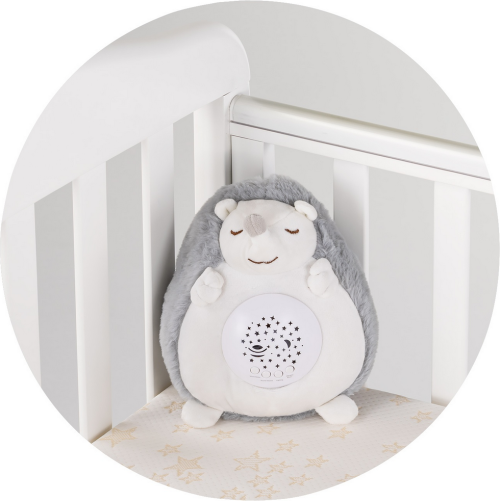 Každá hračka má vstavanú hudobnú skrinku s 10 uspávankami a 5 druhmi bieleho šumu, ktoré napodobňujú známe zvuky z maternice i prírody. Jedným tlačidlom sa aktivuje farebný LED projektor s rôznymi kombináciami červenej, zelenej a modrej farby, ktoré sa plynule striedajú a dieťa upokojujú. K dispozícii sú 3 úrovne hlasitosti a jednoduché ovládanie pomocou intuitívnych tlačidiel. Hudobnú skrinku je možné vybrať, takže plyšovú časť je možné prať ručne pri 30 °C. Na prevádzku sú potrebné 3ks batérie typu AAA (nie sú súčasťou balenia).